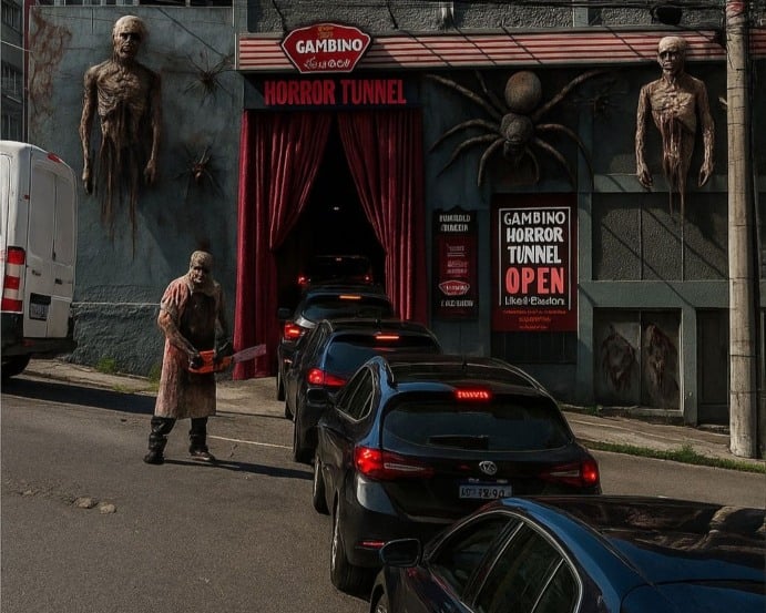 De 26 a 28 de outubro, das 17h às 21h, o Posto Gambino Matriz de Caxias do Sul promete arrepiar os motoristas com o Túnel do Medo – Drive-in Gambino. A proposta é simples — e assustadora: quem tiver coragem vai atravessar de carro um percurso cheio de gritos, sustos e personagens sombrios.