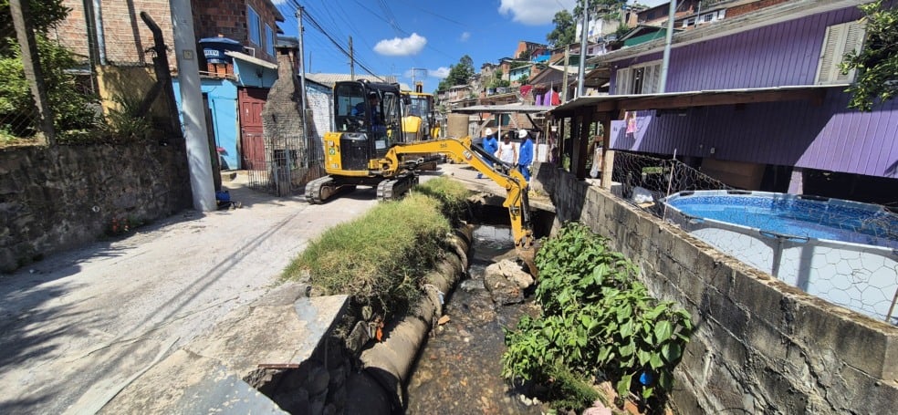Uma obra de contenção está sendo realizada na rua Danilo Tarquino Basso, no bairro Planalto, em Caxias do Sul, após um processo erosivo às margens de um canal pluvial que corta a via. A situação foi agravada pelas chuvas intensas registradas nos útlimos meses e passou a comprometer a estabilidade do local.