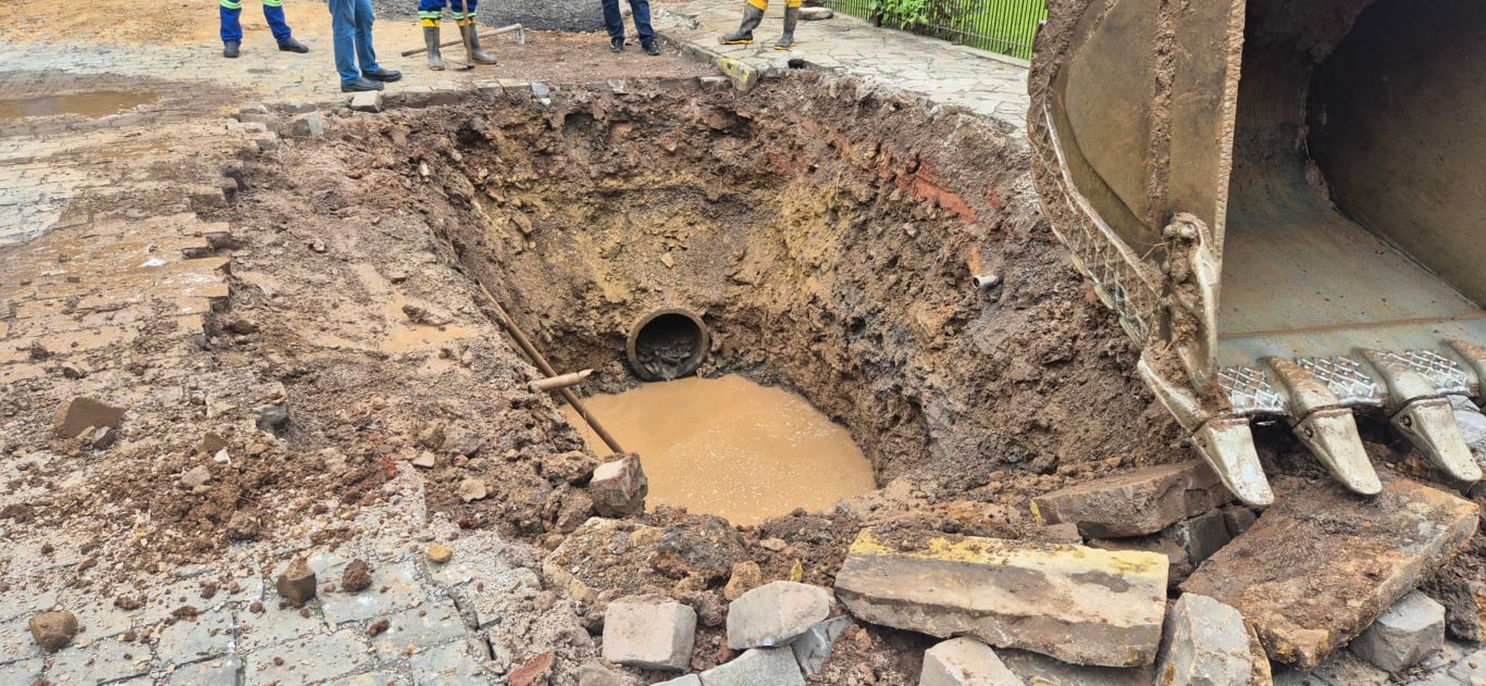 Para solucionar a situação de forma definitiva, estão sendo substituídos os tubos danificados por uma rede com maior capacidade de vazão, adequada ao volume hídrico que cruza o local.