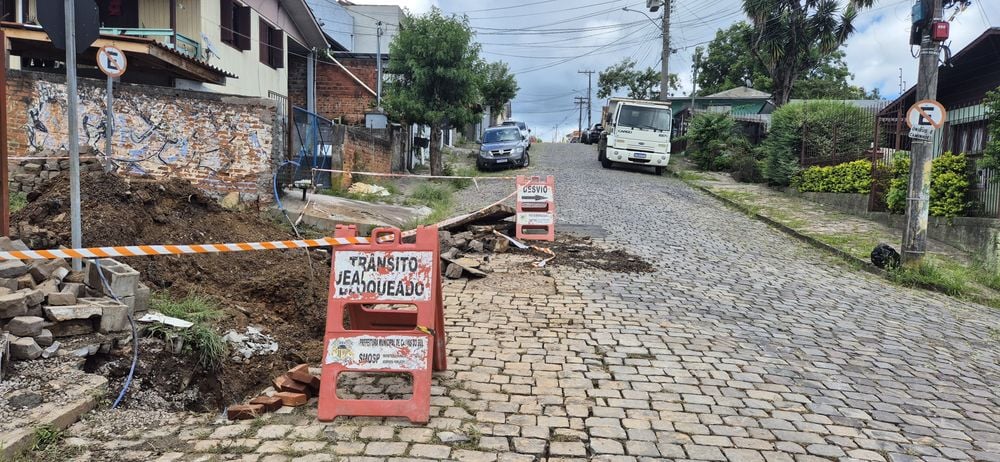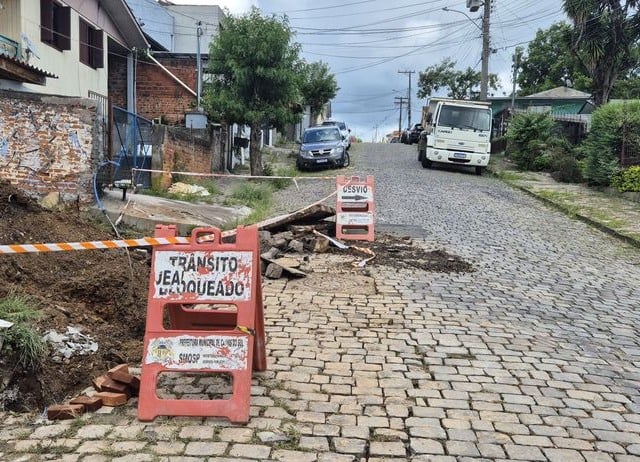 Em função da complexidade da obra e da movimentação de máquinas, a Rua Nercy Sambaqui, na esquina com a Rua José Scalabrim, está totalmente interditada. O bloqueio garante a segurança dos trabalhadores e da população.
