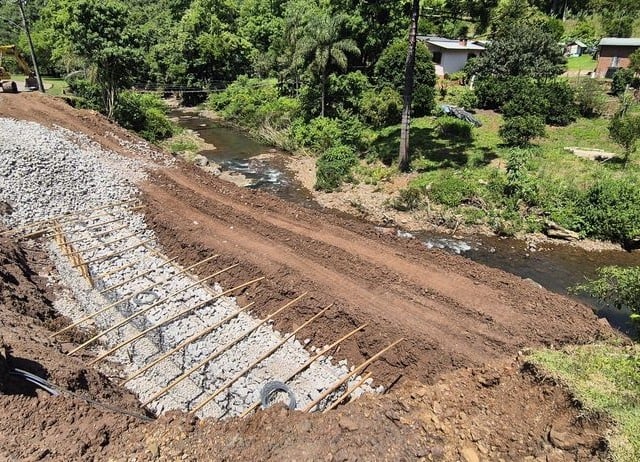 Caxias do Sul deu mais um passo na recuperação da Estrada Municipal do Vinho, no distrito de Vila Cristina. A Secretaria Municipal de Obras (SMO) avança na construção dos gabiões de contenção, com as equipes trabalhando atualmente na estrutura em frente à Cantina Motter.