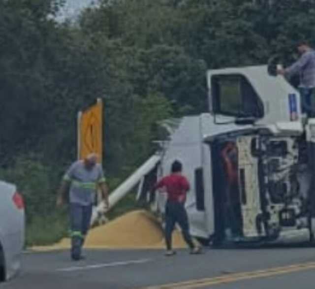 O trânsito no local segue lento, com fluxo em meia pista, enquanto equipes trabalham no atendimento e retirada da carga. Motoristas devem redobrar a atenção ao passar pelo trecho afetado.