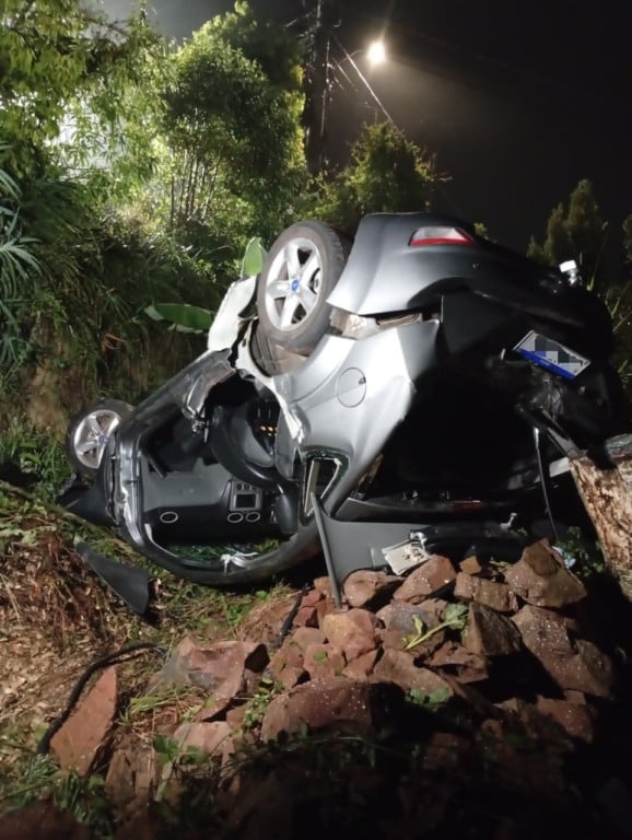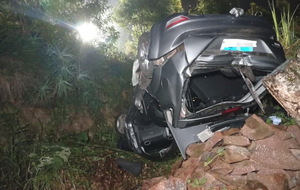 No local, os bombeiros encontraram um Ford Focus, com placas de Novo Hamburgo, que saiu da pista e capotou em um barranco de aproximadamente quatro metros.