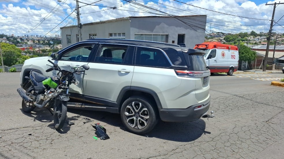 Caxias do Sul - Um motociclista ficou ferido após um acidente de trânsito registrado na manhã desta terça-feira (13), no cruzamento da rua Antônio Andrighetti com a rua Tanoeiros, no bairro Santa Fé, em Caxias do Sul. A colisão envolveu uma motocicleta e um Jeep Compass.