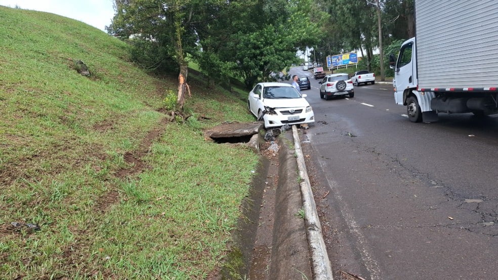 Caxias do Sul - Um motorista perdeu o controle do veículo ao fazer uma curva na Perimetral Rubem Bento Alves, em Caxias do Sul, e acabou colidindo contra a laje de concreto de um bueiro e, na sequência, contra uma árvore. Com o impacto, o carro ficou trancado sobre o cordão da via.
