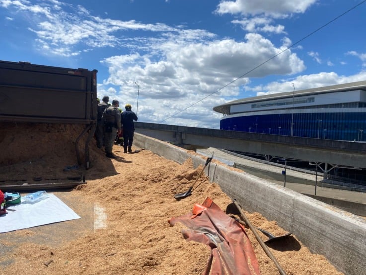 A Polícia Rodoviária Federal (PRF) e o Corpo de Bombeiros foram acionados para atender a ocorrência. A carga ficou espalhada pela pista e a mulher está viva, mas precisou ser resgatada, uma vez que o produto é muito pesado.