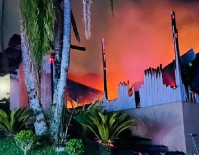 Cotiporã - Um incêndio de grandes proporções destruiu uma residência na localidade de Lajeado Bonito, em Cotiporã, na noite de domingo (25), por volta das 21h30. O imóvel, de edificação mista — madeira e alvenaria —, tinha cerca de 100 metros quadrados e foi totalmente consumido pelo fogo.