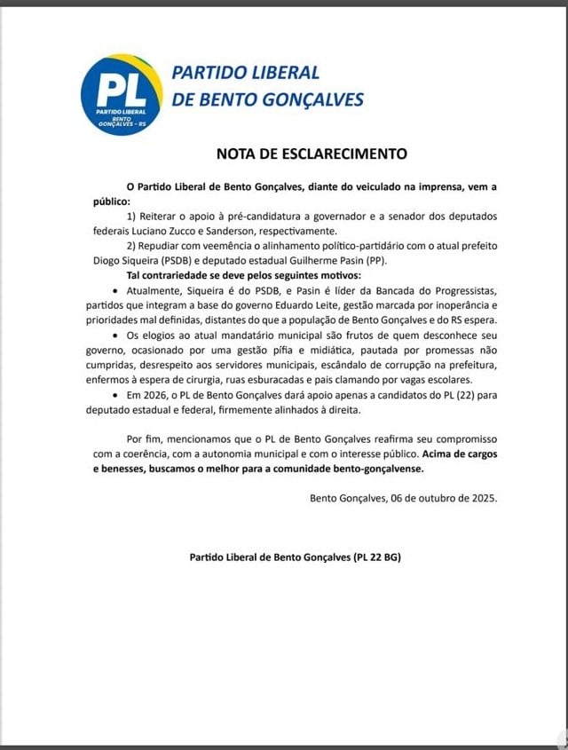 Bento Gonçalves - Em nota oficial, o diretório municipal do PL de Bento Gonçalves confirmou aquilo havia antecipado o vereador Sidinei Postal: o total desacordo da sigla em relação ao governo Diogo Siqueira e estendeu ainda o afastamento ao outro partido que compõe o Executivo municipal, o PP.