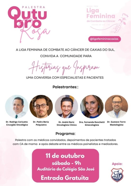 A Liga Feminina de Combate ao Câncer de Caxias do Sul realiza neste sábado(11), a palestra “Histórias que Inspiram”, que integra a programação do Outubro Rosa na cidade. O encontro será no auditório do Colégio São José, a partir das 9h, com entrada gratuita e participação aberta à comunidade.