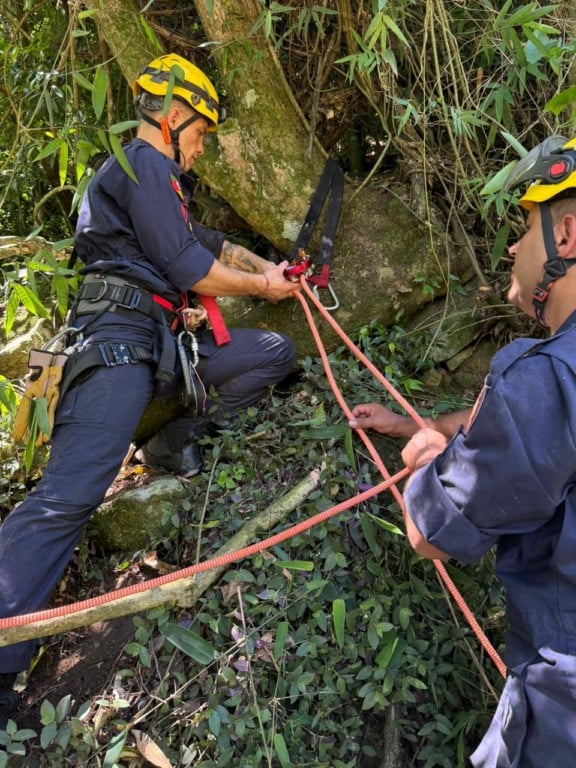 A primeira ação da equipe foi realizar um mapeamento da área com um drone para direcionar a busca. Após localizar a posição exata, os bombeiros acessaram a mata em terreno acidentado, percorrendo cerca de 3 km com desnível de 200 metros. Foi necessário descer aproximadamente 80 metros com cordas para alcançar e resgatar o animal.