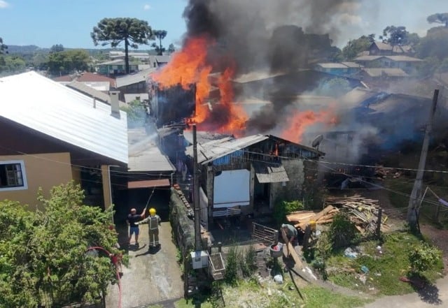 Populares relataram que um homem teria chegado ao local com combustível e ateado fogo em uma das casas, provocando o incêndio. Até o momento, não há registro de feridos. A Polícia Civil investiga o caso.