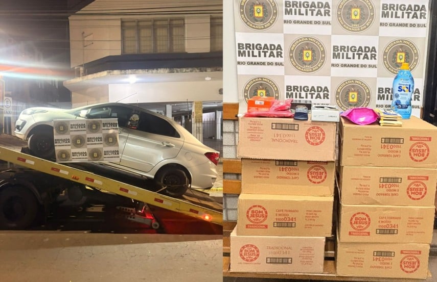 Com os suspeitos, os policiais apreenderam diversas mercadorias, três celulares e o veículo usado na fuga.
