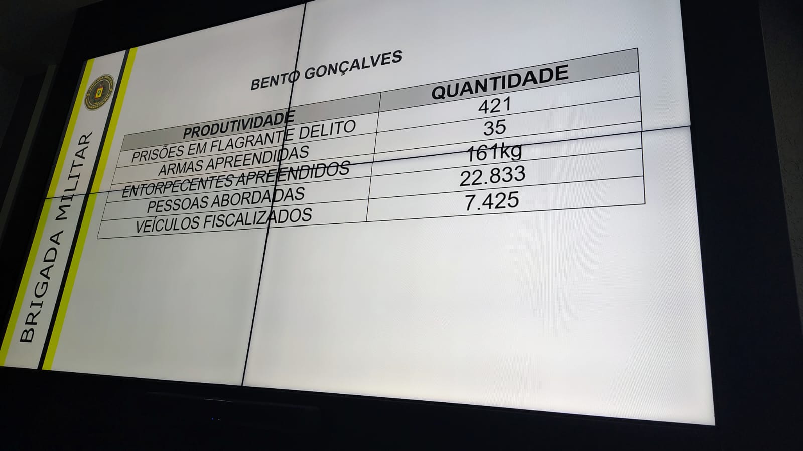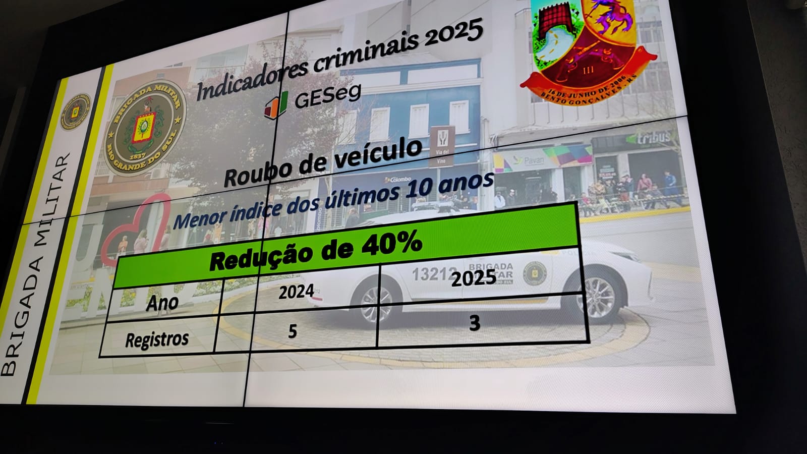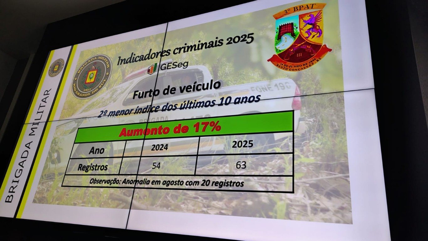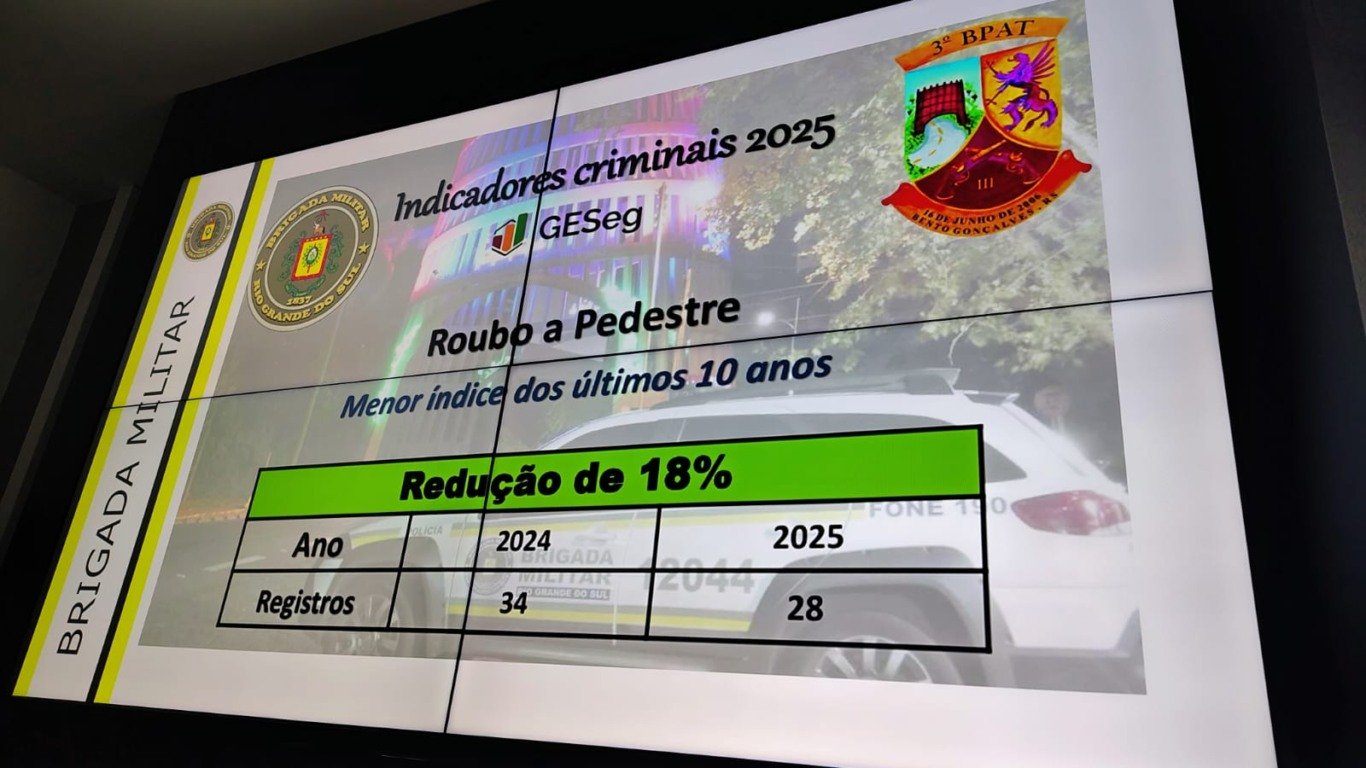 Bento Gonçalves - O 3º Batalhão de Policiamento em Áreas Turísticas (3º BPAT) da Brigada Militar divulgou, na tarde desta terça-feira (11), os indicadores de criminalidade de Bento Gonçalves durante coletiva na sede do batalhão, no bairro Cohab. Nos primeiros dez meses de 2025 foram registrados 24 Crimes Violentos Letais Intencionais (CVLI), contra 34 no mesmo período de 2024 — uma redução de 29%.