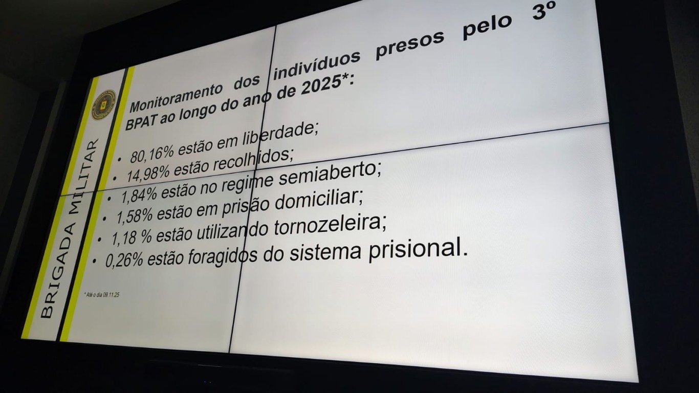Em produtividade operacional, a Brigada Militar efetuou 421 prisões em flagrante até o fim de outubro, apreendeu 35 armas e retirou de circulação 161 quilos de drogas. De acordo com dados do 3º BPAT, cerca de 80% das pessoas presas ao longo de 2025 já foram liberadas pela Justiça.