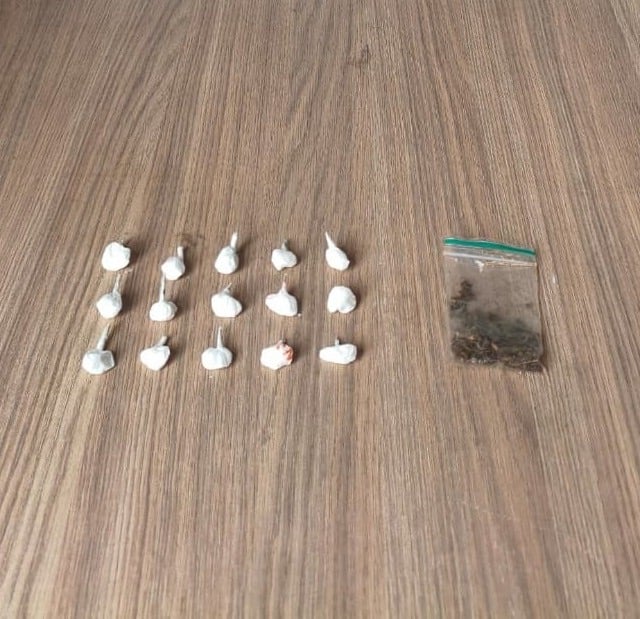 Com um dos abordados, a BM apreendeu 15 porções de cocaína e duas porções de maconha, todas embaladas e prontas para a venda.