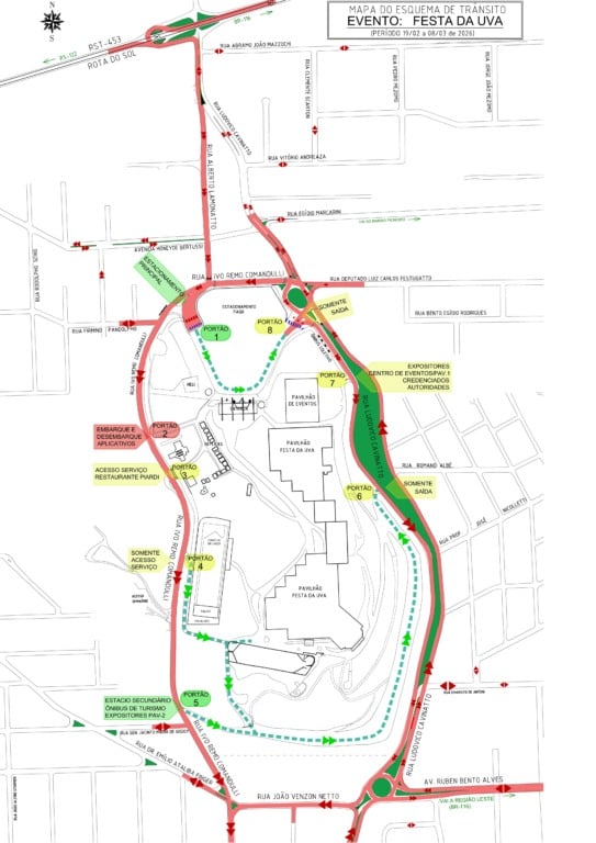 A Secretaria Municipal de Trânsito, Transportes e Mobilidade divulgou o esquema especial de trânsito para a 35ª Festa Nacional da Uva, que ocorre em Caxias do Sul entre fevereiro e março. As medidas envolvem organização de acessos ao Parque de Eventos, definição de portões específicos para cada tipo de veículo e bloqueios programados no centro da cidade durante os desfiles.