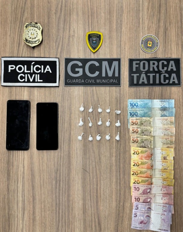Durante a ofensiva, os agentes flagraram a dupla com porções de cocaína, dinheiro em espécie e dois aparelhos celulares. O homem foi autuado por tráfico de drogas. O adolescente responderá por ato infracional análogo ao tráfico.