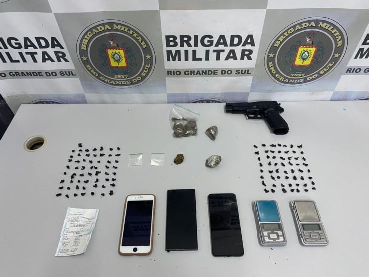 Durante a ação, foram apreendidos 113 pedras de crack, quatro porções de maconha, duas porções de cocaína, três celulares, um simulacro de arma de fogo, duas balanças de precisão e um comprovante de depósito.