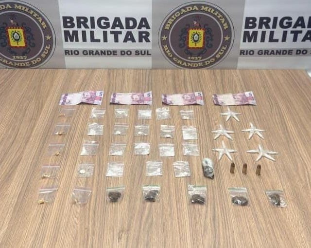A equipe, durante patrulhamento tático motorizado, localizou e abordou o suspeito. Com ele foram encontradas três munições calibre 9mm, seis porções de crack, seis porções de maconha, 44 porções de cocaína e R$ 20.