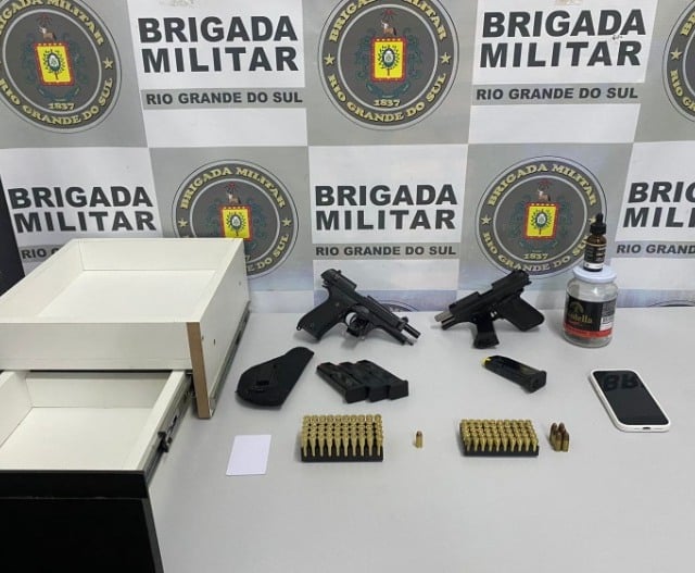 Com ela, os policiais apreenderam duas pistolas, diversos carregadores, munições de vários calibres e uma pequena porção de maconha.