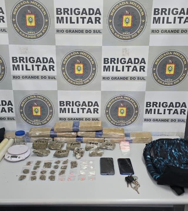 Na ação, foram apreendidas uma balança de precisão, dois celulares, 6 tijolos e 27 porções de maconha, seis porções de cocaína, 10 unidades de ecstasy, diversas embalagens ziplock, dois rolos de plástico filme, uma mochila, uma pochete, uma faca, um pote, R$ 34 em espécie e um veículo Jeep Renegade.