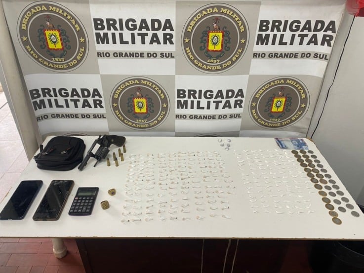 A ação aconteceu em uma área já conhecida pelo comércio ilegal de entorpecentes. Durante patrulhamento, os policiais abordaram os suspeitos e encontraram, com o homem de 20 anos, um revólver calibre .38 com cinco munições intactas no tambor e uma avulsa no bolso. Além da arma, ele carregava 105 porções de cocaína, 42 pedras de crack, 5 porções de maconha, R$ 35 em dinheiro e um celular.