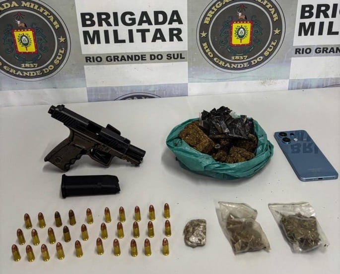 Durante a ação, foram apreendidas uma pistola EMTAN .933, quatro porções de maconha, um aparelho celular e 30 munições .9mm