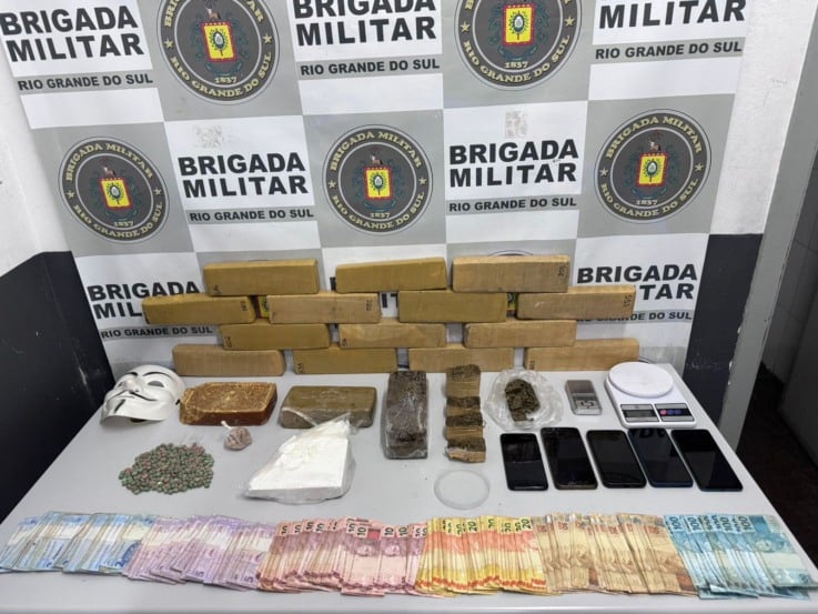 Durante a ação, foram apreendidos 9,9 kg de maconha, cerca de 2 kg de crack, um tijolo de cocaína, 260 comprimidos de ecstasy, cinco celulares, duas balanças de precisão, uma máscara e R$ 5.293 em espécie.