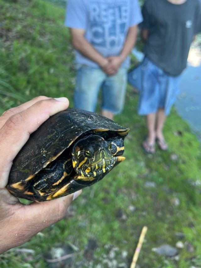 Com a dupla, os agentes localizaram uma tartaruga de água doce capturada com armadilha artesanal e lambaris vivos. O material de pesca foi apreendido, a tartaruga e os peixes foram devolvidos ao habitat natural, e ambos foram encaminhados à Delegacia de Polícia para registro da ocorrência.