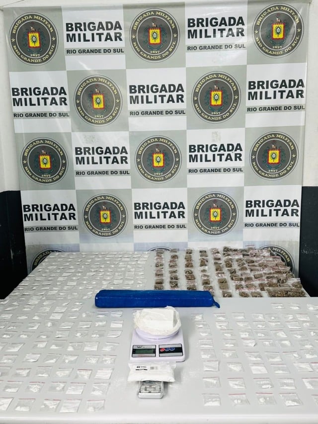 No bairro Nossa Senhora das Graças, um homem de 27 anos foi detido com cerca de 700 gramas de cocaína, distribuídas em 296 porções e uma pedra, além de mais de 1 kg de maconha em 101 porções e um tijolo. Duas balanças de precisão também foram apreendidas no local.