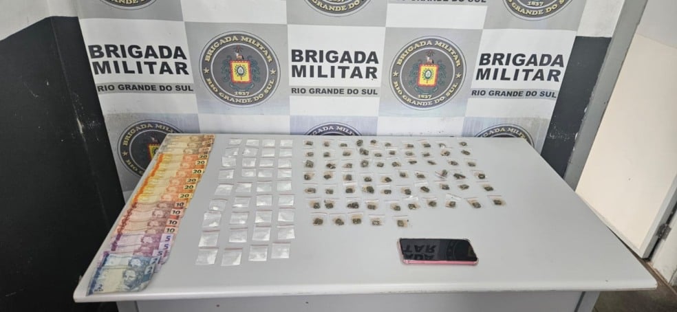 De acordo com a corporação, durante a abordagem foram apreendidas 36 porções de cocaína, totalizando 19,5 gramas, além de 65 porções de maconha, somando 80,5 gramas. Os policiais também encontraram R$ 329 em dinheiro.