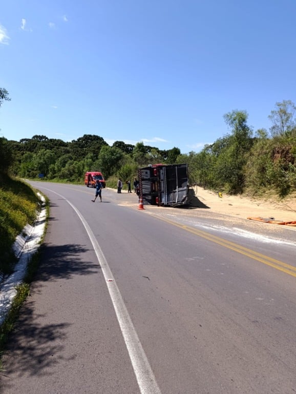 Um caminhão saiu da pista na BR-285, no km 150, no município de Muitos Capões, nas proximidades do rio Saltinho, na tarde desta quinta-feira (8). O veículo seguia no sentido Muitos Capões–Vacaria.