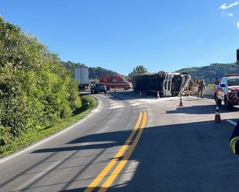Em função do tombamento, o trânsito no trecho segue em sistema pare e siga, com fluxo lento nos dois sentidos da rodovia. Motoristas que trafegam pela região devem redobrar a atenção.