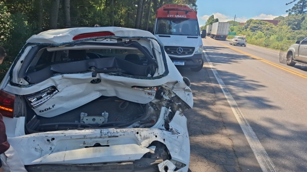 A equipe do Samu atendeu a vítima no local. Ela sofreu escoriações, sem gravidade. No Golf estavam três pessoas: o motorista, a esposa e o filho. Eles não se feriram, mas passaram por avaliação médica.