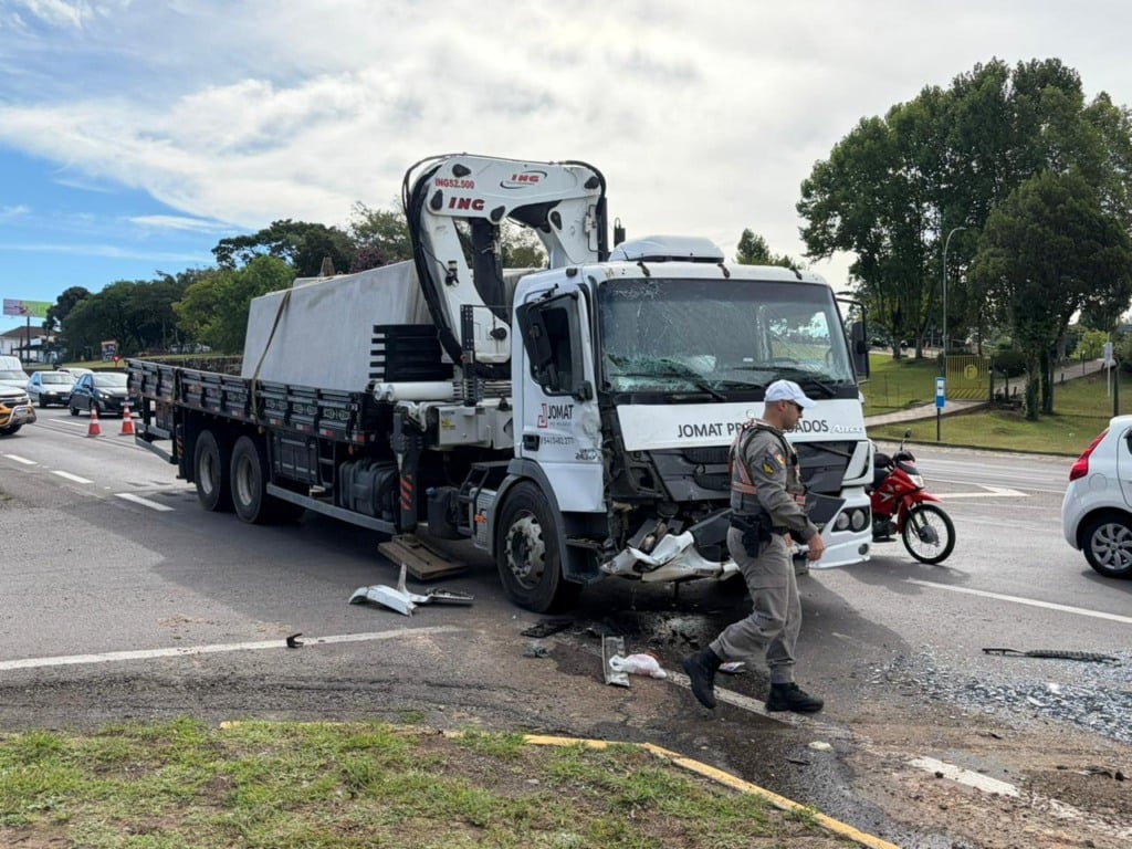 Nesse momento, um caminhão de uma empresa de lajes pré-moldadas, que seguia no sentido Farroupilha–Caxias e estava carregado com material pesado, não conseguiu frear a tempo e acabou atingindo a lateral do ônibus.