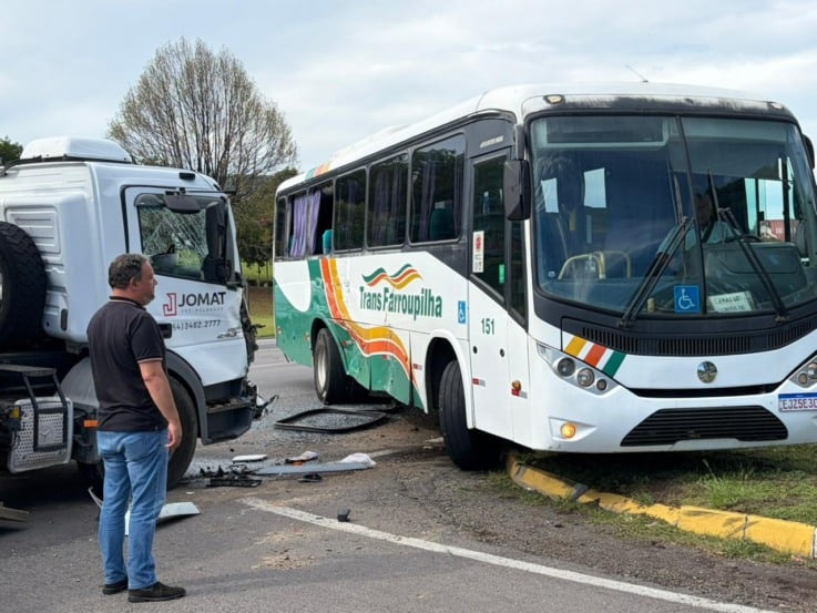 Caxias do Sul - Um acidente de trânsito envolvendo um ônibus de transporte fretado e um caminhão carregado com lajes pré-moldadas foi registrado na tarde desta segunda-feira (16), entre 15h e 15h30, na ERS-122, no quilômetro 55, em frente à empresa Fras-le, no trecho entre Caxias do Sul e Farroupilha.