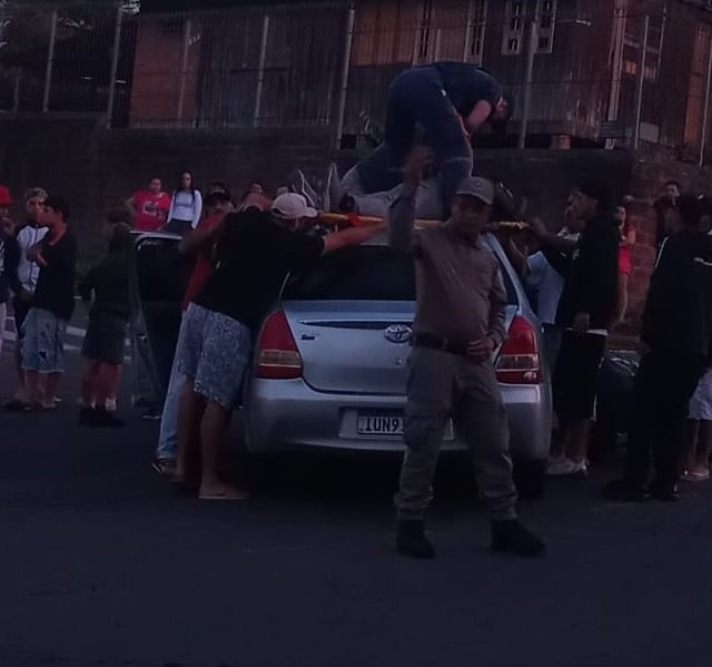 Quem estava perto correu para ajudar, mas a cena exigiu perícia profissional. A equipe do Samu subiu no carro e usou técnicas específicas para retirar o motociclista do alto do veículo e colocá-lo com segurança na maca. Os socorristas evitaram divulgar o nome e o estado de saúde da vítima.