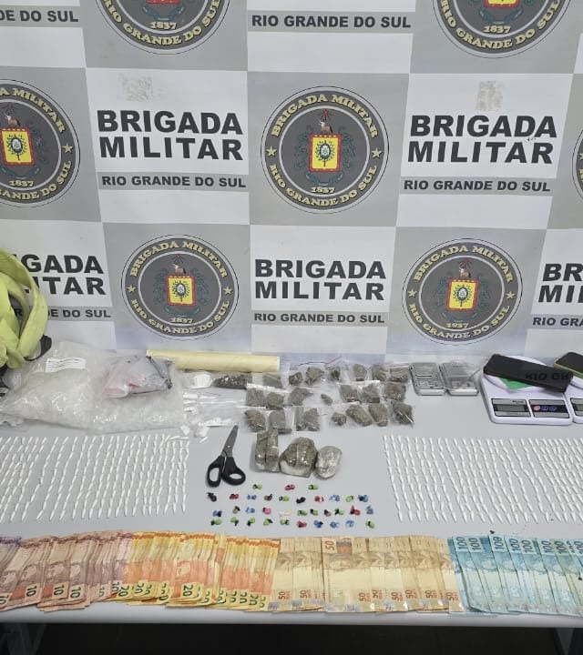 Com o trio, foram apreendidas quatro balanças de precisão, dois celulares, 606 porções de cocaína, 34 porções de crack, 25 porções de maconha, R$ 4.088 em espécie e um veículo Renault/Clio. Também foram recolhidos, duas mochilas pretas e diversas embalagens de pinos eppendorf, utilizados no acondicionamento da droga.