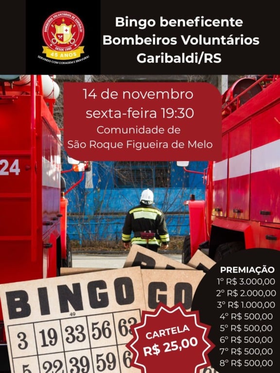 Os Bombeiros Voluntários de Garibaldi promovem no dia 14 de novembro, a partir das 19h30, um bingo beneficente na Comunidade de São Roque Figueira de Melo. A ação busca envolver a comunidade em um momento de confraternização e solidariedade, com renda totalmente revertida à compra de equipamentos, manutenção de viaturas e estrutura da nova sede da corporação.