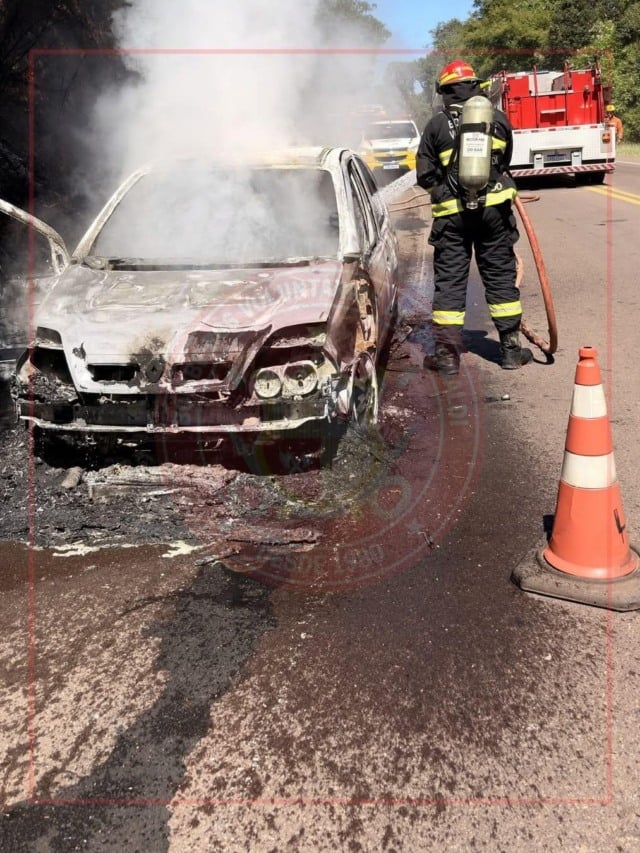 Garibaldi e Rio Grande do Sul - Uma manhã de susto para motoristas que trafegavam pela Rota do Sol, em Garibaldi. Por volta das 10h15 desta segunda-feira (23), os Bombeiros Voluntários de Garibaldi receberam um chamado para atender a um incêndio veicular na rodovia RCS-453, no km 67. Quando a equipe chegou ao local, um Chevrolet Meriva já estava completamente tomado pelas chamas às margens da via.