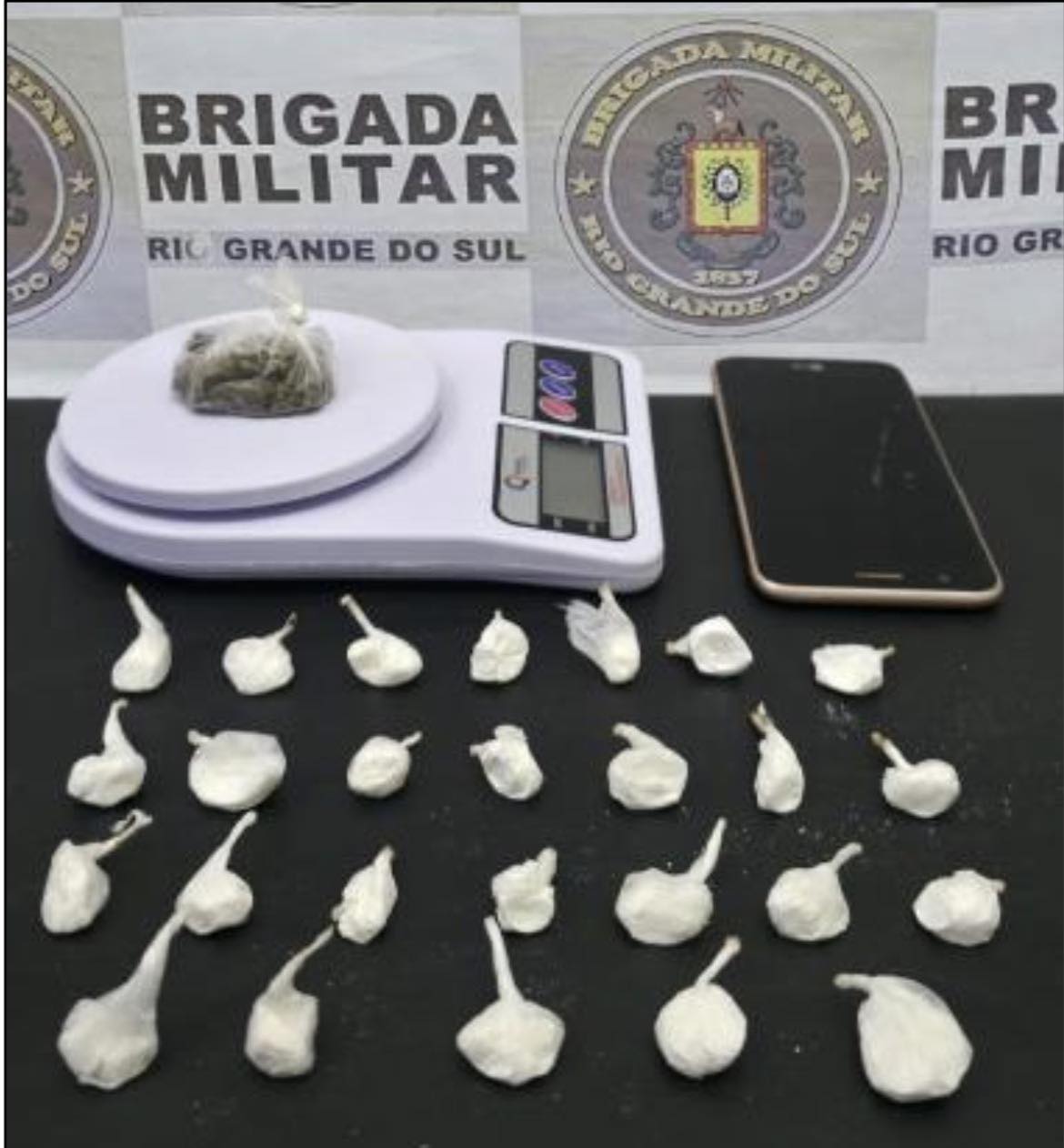 Durante a abordagem, os policiais encontraram com a mulher, de 26 anos, porções de cocaína já preparadas para comercialização, uma quantidade de maconha e um celular apoiado sobre uma balança de precisão. Diante do material apreendido, os agentes efetuaram a prisão em flagrante.
